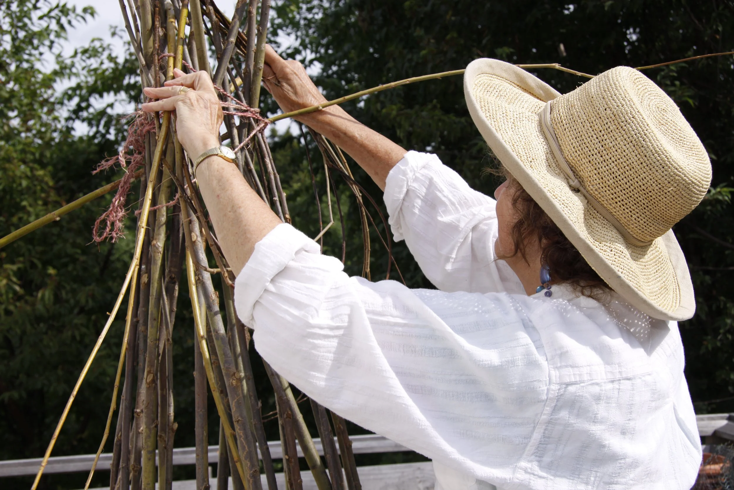 Interpreting universal human form, or architectonic column-like forms, she generally works with natural materials. There is an increasing interest in her life size willow works cast into bronze for outdoor installations and sculpture gardens.